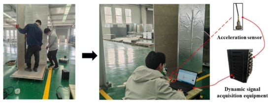 In order to accurately ascertain the operational functionality of raised floors within real-world environments, corresponding wall systems were meticulously installed to adhere to the demands of the decorative setting. Walking activities were employed as external excitation signals for time-domain signal acquisition on the floor. The experimental setup involved the utilization of piezoelectric acceleration sensors in conjunction with their respective constant current sources, alongside multi-channel dynamic signal acquisition apparatus. The sensitivity of the piezoelectric acceleration sensor utilized in the study was noted to be 10.223 mV/m·S−2, with a sampling frequency of 1000 Hz for the multi-channel dynamic signal acquisition equipment. During operation, the constant current source facilitated the provision of electrical energy to the accelerometer, enabling the collection of vibration signals. These signals were subsequently transmitted and converted by the dynamic signal analyzer. Subsequently, the acquired data were meticulously analyzed and processed via software installed on a computer system. Figure 6 provides a detailed illustration of the specific experimental procedures and the environmental conditions present on site.