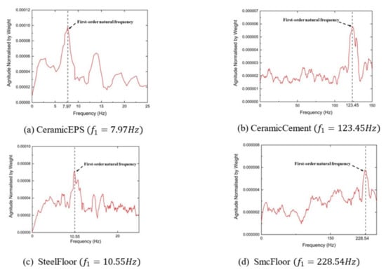 The time-domain signal underwent fast Fourier transform to obtain frequency spectrum data ranging from 0 to 500 Hz. The distinct structural characteristics of the four types of raised flooring result in varying natural frequencies. During frequency domain analysis, high frequencies may not significantly contribute to structural analysis. Thus, it is possible to selectively extract appropriate frequency bands for further analysis based on specific requirements. By applying fast Fourier transform to the time-domain signal and utilizing smoothing techniques, Figure 7 displays the processed frequency domain signal.