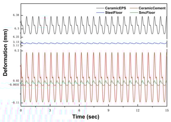 The deformation–time curves of four different types of raised floors were analyzed under a pedestrian load excitation with a stepping frequency of 1.7 Hz, as shown in Figure 8. It is evident that the curves exhibit harmonic deformation characteristics attributed to the pedestrian load excitation function being represented as a superposition of harmonic loads. Among the raised floors studied, the CeramicEPS and SteelFloor, which incorporate easily deformable foam in their structure (EPS), exhibited larger maximum deformation displacements. The CeramicCement composite floor displayed the most significant deformation amplitude. In contrast, the SmcFloor and SteelFloor, composed of materials with lower elastic moduli, exhibited relatively smaller deformation amplitudes.