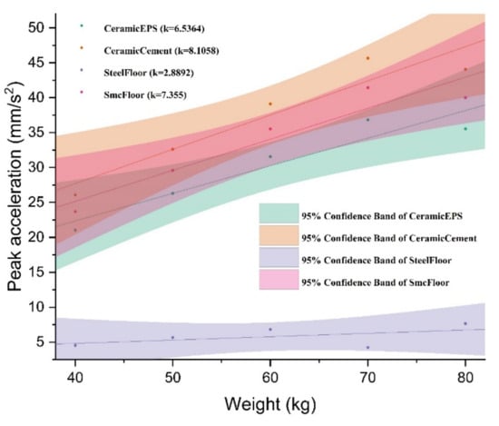 In assessing the pedestrian comfort on raised flooring, it is crucial to consider the significant influence of pedestrian body weight on the calculation results [,,]. This study undertakes a comprehensive analysis of outcomes calculated across various weight categories, as depicted in Figure 9. To improve the accuracy of these calculations, the figure incorporates colored blocks to delineate the 95% confidence intervals pertinent to the specific type of flooring. The findings reveal that the peak acceleration of the computed results predominantly demonstrates a linear relationship with body weight, which can be mathematically represented by Equation (7). However, it is essential to note that the linear proportionality constant (k) varies across different flooring types. A higher k value suggests increased sensitivity of the flooring to weight, indicating that the perception of pedestrian comfort will differ more noticeably among individuals with varying body weights. Based on the analysis of pedestrian comfort across a spectrum of weights, the comfort ranking for the four types of raised floorings is determined as follows: SteelFloor > CeramicEPS > SmcFloor > CeramicCement. This ranking aligns precisely with the comfort evaluations obtained through previous assessment methodologies.
