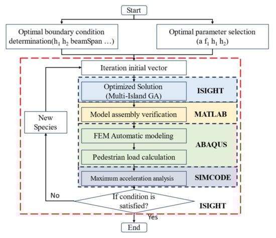 The approach taken in this paper to optimize the comfort of walking on raised floors was to calculate the first-order vertical natural frequencies and peak accelerations for different sizes of optimization variables, in order to determine the final optimized dimensions. Figure 11 illustrates the optimization design process adopted in this paper. The Isight software leverages its built-in algorithms to create models of various components within a raised floor system and conducts finite element analysis for parametric exploration. Due to the complex nature of a raised floor assembly, a Matlab module was employed to validate the data produced by Isight, ensuring consistency in the assembly conditions of the components and providing model dimensions that adhered to the operational requirements of Abaqus upon regeneration. The Abaqus module then conducted finite element analysis on the refined model, yielding crucial information such as the total thickness of the support plate layer and the displacement–time curve of the most critical point. The Simcode module, consisting of custom-written programs, calculated the second derivative of the deformation–time curve derived from Abaqus. This calculation revealed the peak acceleration value in the most susceptible vibration zone under walking-induced excitation. The code used for this calculation is provided in the Supplementary Material. By seamlessly integrating Matlab, Abaqus, and Simcode, Isight facilitated a comprehensive comfort analysis of the raised floor system under walking excitation. Following the optimization process, the results were meticulously scrutinized to ascertain if the first-order vertical resonance frequency met the stipulated criteria. If deemed feasible, the product underwent prototyping; conversely, any shortcomings in the results prompted a thorough examination to identify areas for further optimization and improvement.