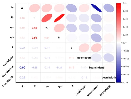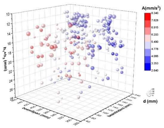 Figure 12 illustrates the relationship between optimization parameters and objectives in the context of thermal performance and pedestrian comfort of raised floors. Optimization parameters are represented by the X-axis, Y-axis, and sphere size, while optimization objectives are depicted by the sphere color. The Y-axis serves a dual role as both an optimization parameter and objective. The color of the spheres in Figure 11 indicates the level of optimization achieved, with bluer colors and lower Z-axis values signaling more comprehensive optimization. Upon completion of calculations, a correlation analysis of the optimization results can be conducted to qualitatively assess the impact of raised floor dimensions on peak acceleration. As a statistical tool, correlation analysis plays a pivotal role in understanding the nature, strength, direction, and trends in relationships between variables. Figure 13 illustrates a correlation heatmap of optimized parameters for CeramicEPS, with the axes representing distinct parameters. Parameter A denotes the peak acceleration derived from dynamic response analysis, while R signifies the thermal resistance of the raised floor. The variables h1 and h2 represent the thicknesses of the EPS and waterproof boards, respectively, while beamSpan, beamIndent, beamWidth, and d are dimensions related to the raised floor support structure, further detailed in Table 6. Notably, a higher A value is inversely associated with pedestrian comfort, whereas an elevated R value implies a decline in the thermal performance of the raised floor. The heatmap analysis elucidates that the most significant factor affecting pedestrian comfort is the shape of the support structure. Conversely, the primary factor influencing thermal performance is not the thickness of the EPS, but the thickness of the waterproof board. Therefore, by thoughtfully designing the shape of the support structure, one can substantially enhance the pedestrian comfort of raised floors. Concurrently, within the constraints of waterproofing requirements, reducing the thickness of both the EPS and the waterproof board can effectively improve thermal performance.