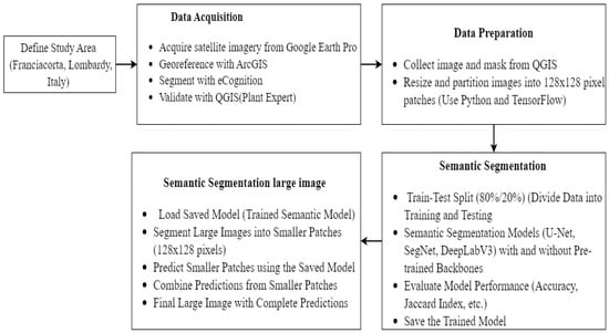The research methodology consisted of four sequential steps, as illustrated in Figure 1. Firstly, the study focused on the Franciacorta area in Lombardy, Northern Italy, defining the geographical context. Secondly, satellite imagery was acquired from Google Earth Pro, georeferenced with ArcGIS, and segmented using eCognition to create homogeneous image regions. In the third step, these segmented images were validated and classified by a plant expert using QGISto ensure accurate identification of land cover types such as grasslands and vineyards. Lastly, the fourth step involved training semantic segmentation models U-Net, SegNet, and DeepLabV3—on smaller image patches derived from the large original images, with and without pre-trained backbones. Models were assessed based on performance metrics such as accuracy and the Jaccard Index, thereby completing a thorough approach to land cover analysis and classification.