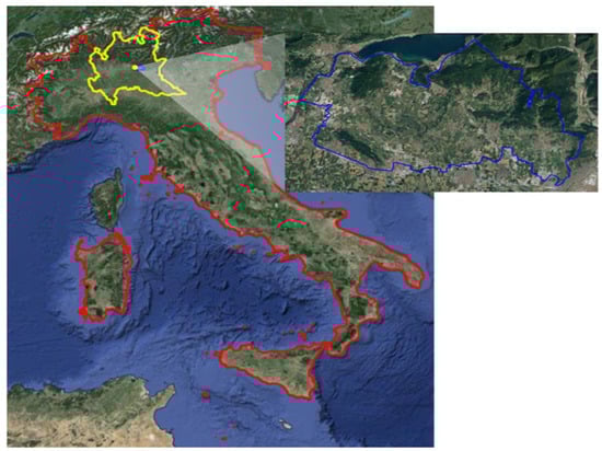 Geographic coverage of the study area in Franciacorta, Lombardy, Northern Italy. Here Italy is outlined in red, Lombardy in yellow, and the study area in blue.