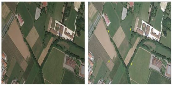 Validation process of segmented shape file in QGIS: original image (left); segmented classes (right). Grasslands are shown in green, arable lands in yellow, herb-dominated habitats in medium-dark green, vineyards in purple, tree-dominated man-made habitats in black. Additionally, Olea europaea groves are shown in brown.