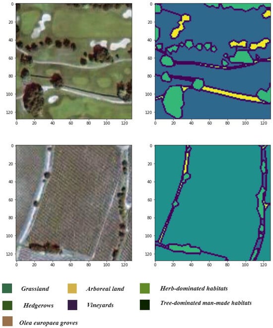 Our semantic segmentation models (Unet, SegNet, and DeepLabV3) utilized TensorFlow and the segmentation-models library to perform image segmentation. The dataset consisted of a total of 765 images, divided into training and testing sets with a ratio of 0.80 and 0.20, respectively. Each image was annotated with one of seven classes: grasslands, arable land, herb-dominated habitats, hedgerows, vineyards, tree-dominated man-made habitats, and Olea europea groves. Initially, the images and their corresponding masks were loaded from the specified directories and pre-processed accordingly. The masks were encoded using label encoding and then split into training and testing datasets. Next, the model was configured with specific parameters, including the EfficientNet backbone architecture and a combination of Dice loss and Categorical Focal loss as optimization objectives. To address the class imbalance inherent in the dataset, we implemented class weighting based on Dice scores. This technique assigns higher weights to classes with lower coverage, ensuring that the model learns effectively from all classes. The model was trained using hyperparameters, as shown in Table 1. After training, the model was saved for future reference. Performance metrics such as accuracy, precision, recall, F1 score, Jaccard score, and mean IoU were computed using the trained model on the test dataset. Finally, the results were printed to evaluate the segmentation model’s performance.