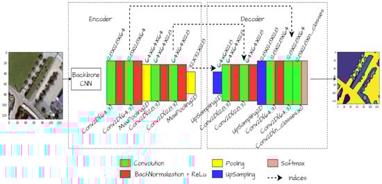 SegNet [] is a convolutional neural network (CNN) architecture specifically tailored for semantic segmentation tasks, where the goal is to assign a class label to each pixel in an image. It features an encoder–decoder structure, which comprises an encoding path to extract hierarchical features from the input image and a decoding path to generate a pixel-wise segmentation map. Our SegNet semantic segmentation model, depicted in Figure 7, is optimized with the EfficientNetB0 architecture serving as its foundational backbone, with connected layers fully omitted to streamline feature extraction from input images. The model is structured around an encoder–decoder architecture, each fulfilling distinct roles in the segmentation process.