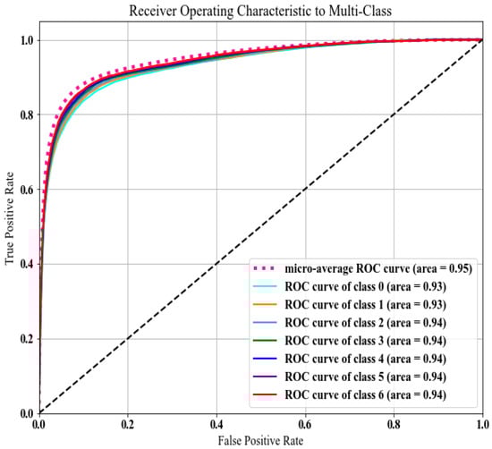 We analyzed the receiver operating characteristic (ROC) curves, as shown in Figure 9, to evaluate our multi-class classification model’s performance. The curves visualize the trade-off between true positive rate (TPR) and false positive rate (FPR) for each class, while the micro-average ROC curve summarizes the overall performance. The area under curve (AUC) quantifies the model’s discriminative power. High AUC values, with the micro-average reaching 0.95 and individual class values ranging from 0.93 to 0.94, indicate that our model effectively differentiates between the various land cover classes.