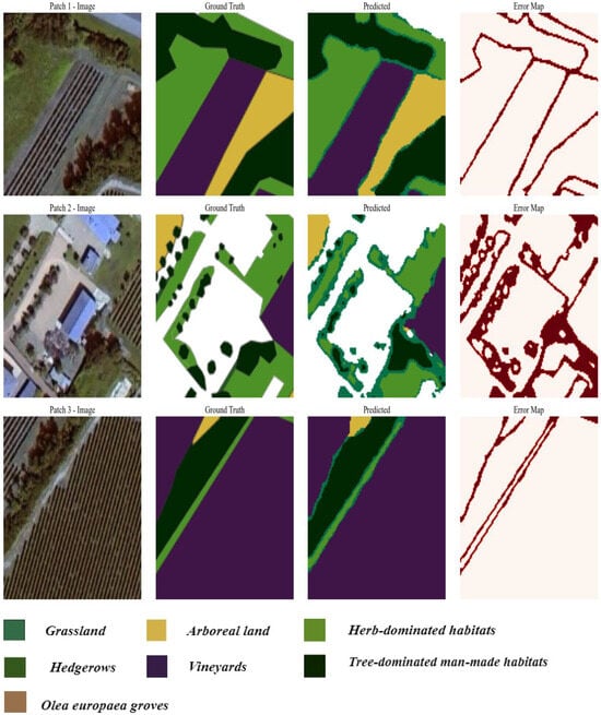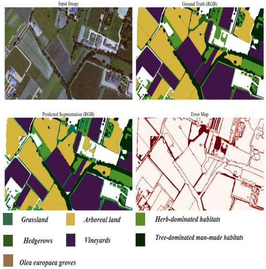 This figure illustrates the original image, the ground truth mask, the final segmented image mask obtained by applying a trained model, and the error map. The model segments the large image into patches, generates predictions for each patch, and seamlessly stitches the segmented patches together to reconstruct the predicted mask for the entire large image. The colors represent different land cover classes: green for grasslands, yellow for arable land, medium-dark green for herb-dominated habitats, purple for vineyards, black for tree-dominated man-made habitats, and brown for Olea europaea groves.