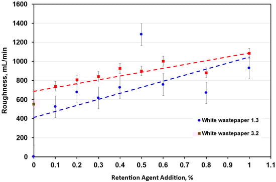Another tested parameter, i.e., roughness, is closely related to porosity. The tests performed indicate that the roughness of reference papers (406 μm for 1.3 wastepaper and 553 μm for 3.2 wastepaper) is significantly lower compared to the samples with the highest addition of retention agent, where the maximum roughness reached 1281 μm and 1084 μm for pulps 1.3 and 3.2, respectively. This significant increase highlights the impact of retention agent dosage on paper structure.