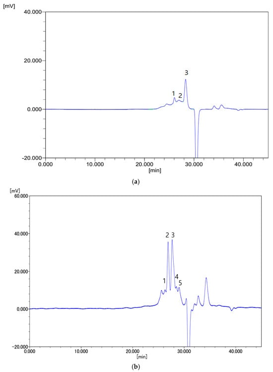 The molecular weight analysis was performed as described by Pan et al. [] using the gel permeation chromatography (GPC) system. Changes in patterns of molecular weight were measured using a GPC device (VP-10AD, RID-10A, Shimadzu Co., Ltd., Kyoto, Japan), and the column, Ultra-hydrogelTM 120.250 (7.8 mm × 300 mm, Waters, Milford, MA, USA) was used. Additionally, a 0.2 M sodium chloride solution was used as the eluent, the column temperature was 40 °C, and the flow rate was 1 mL/min. Ethylene glycol polymer (Service Inc., Joliet, IL, USA) was used as a standard material for molecular weight analysis.