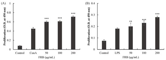 The analysis of the cell proliferation effect of FRB was performed by the method described by Yu et al. []. After sacrificing BALB/c (5-week-old male) mice, spleens were isolated and stored in RPMI 1646 medium (15 mM HEPES buffer with 10% FBS and 1% penicillin). The samples were washed with L-glutamine (50 nM of 2-mercaptoethanol), gently disrupted on sterile slides with a large-sized needle to isolate single cells, and centrifuged (3000× g) for 10 min at 4 °C. Cell pellets were resuspended in ammonium-chloride-potassium lysis buffer for 2 min to remove erythrocytes and then centrifuged again 2 times. The cells number was readjusted to 160 μL of 5 × 105 cells/well, dispensed into a 96-well plate, and then used to evaluate the cell proliferation of the spleen. The splenocyte suspension was diluted to 5 × 105 cells/well in 180 μL, and 20 μL of LPS (500 μg/mL) and Concanavalin A (Con A) (15 μg/mL), respectively, were added in a 96-well plate. After treating the FRB (50, 100, and 200 μg/mL) in wells by 10 μL, it was incubated for 48 h at 37 °C and 5% carbon dioxide (CO2) to give an MTT indicator. To compare spleen cell proliferation capacity, 20 μL of each was treated with 5% CO2 at 37 °C for 2 h. The culture medium was removed and washed with 200 μL of 1 × PBS, 100 μL of DMSO was added, and then absorbance was measured (570 nm) [,].