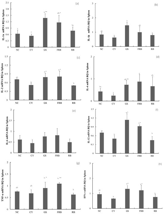 Real time PCR quantitative analysis of cytokine mRNA expression in the spleen. For real- time PCR, we used an SYBR green mix with cytokine gene-specific primers ((a): IL-1α, (b): IN-1β, (c): IL-2, (d): IL-4, (e): IN-6, (f): IL-12, (g): IFN-γ, (h): TNF-α). The level of mRNA expression was normalized with GAP-H. Each value is expressed as mean ± standard deviation. a–c Different letters indicate statistically significant differences between groups using one-way ANOVA followed by Duncan’s test of p < 0.05. Significantly different from the CY Control group (* p < 0.05, ** p < 0.01). (NC: normal control, CY: negative control (CY only), GS: positive control (CY with Ginseng extract 0.5 kg/kg-bw), FRB: CY with FRB 0.5 g/kg-bw, RB: CY with RB 0.5 g/kg-bw).