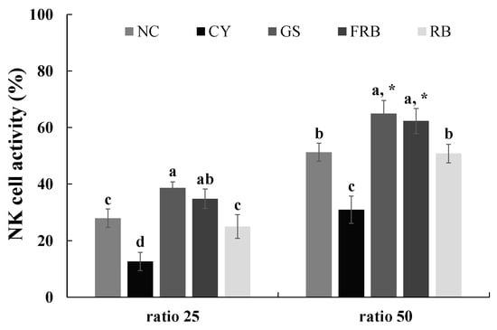 In vivo effect of red ginseng extracts, and FRB (FRB: FRB 0.5 g/kg-b.w., RB: RB 0.5 g/kg-b.w.) on the NK cell activity. After the samples were orally administered for 10 days, spleens were removed from the experimental animals. NK cell activity was investigated at Yac-1 cell and splenocyte ratios of 25:1 and 50:1. In a 96-well culture plate YAC-1 (0.5 × 105 cell/mL) and splenocyte were cultured at ratios of 50:1 and 25:1 for 4 h (37 °C, 5% CO2). a–d Different letters indicate statistically significant differences between groups one-way ANOVA followed by Duncan’s test of p < 0.05. Significantly different from the CY Control group (* p < 0.05). (NC: normal control, CY: negative control (CY only), GS: positive control (CY with Ginseng extract 0.5 kg/kg-bw), FRB: CY with FRB 0.5 g/kg-bw, RB: CY with RB 0.5 g/kg-bw).