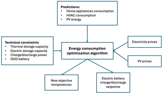 44], an MPC strategy was proposed as a means of improving the operation of a space-heating system that is coupled with renewable resources. This model employs a dynamic approach based on forecasting all energy inputs into the system over a specified period of time in advance, prior to the implementation of any operational decisions. The MPC strategy was implemented with the objective of reducing the annual energy costs associated with the heating system of a detached house, which was equipped with a heat pump, a thermal energy storage unit, and photovoltaic panels. The results demonstrated the efficacy of the model predictive control with a 24 h time horizon, indicating that energy cost savings of 58% could be achieved in comparison to the same heating system without smart control.