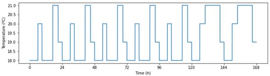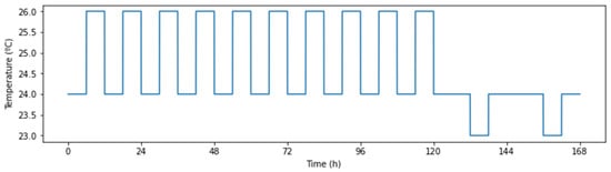 The temperature profile for the home, based on the time of the day and day of the week, is designed to optimize comfort and energy efficiency. On weekdays, the target temperature is set at 24 °C overnight, rising to 26 °C in the morning to accommodate daytime activities. In the afternoon, the temperature is set back to 24 °C to provide a comfortable temperature for the end of the day. In the evening, the temperature is raised again to 26 °C to accommodate nighttime preferences. On weekends, the temperature remains at 24 °C from midnight to noon, providing a cooler atmosphere for sleeping and early morning hours. In the afternoon, the target temperature drops slightly to 23 °C for a cooler, more restful environment. Finally, the temperature returns to 24 °C for the rest of the day, providing comfort for evening activities.