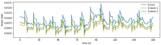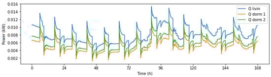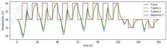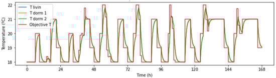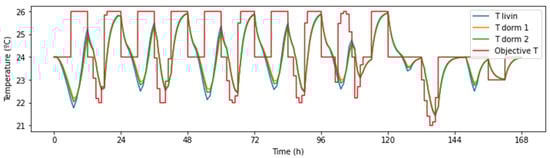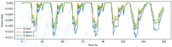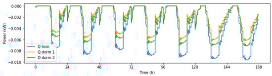 Figure 19. This controlled cooling gradually reduces temperatures until they approach the lower limit of the target range, at which point the system decreases or stops its operation to save energy. This pattern repeats periodically and shows slight variations between the different zones (living room and bedrooms), which, as mentioned before, is due to differences in solar exposure, size, or thermal characteristics of the spaces. Additionally, the cycles are more pronounced during the day when external thermal loads are higher; whereas, at night, the system requires less intervention due to natural ambient cooling. Overall, this demonstrates an efficient thermal control system that dynamically adjusts power usage to maintain temperatures within the set range, maximizing comfort, while optimizing energy consumption.