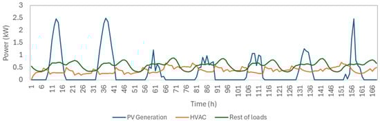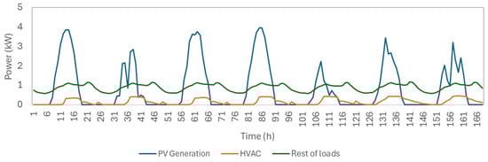 Figure 20, it is evident that, due to the high solar radiation typical of this season, the PV generation reaches significant peaks during the day, exceeding the home’s electrical demands, such as the HVAC system and other loads. This results in energy surpluses, visible as the differences between the PV generation curve and the total loads. These surpluses could be stored in batteries or exported to the grid.