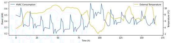 Figure 8), the indoor temperature profile introduces a pattern in the HVAC system’s energy consumption, which interacts with the outdoor temperature, as seen in