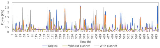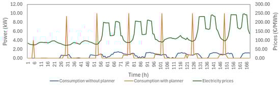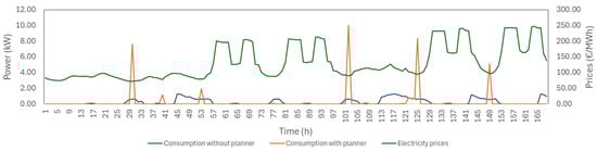 Figure 24 illustrates variations in energy consumption patterns. With a planner, energy usage shows distinct peaks at specific times, reflecting the system’s deliberate strategy to charge the battery and TES during periods of lower electricity prices and reduced demand. This approach allows the system to store energy efficiently, minimizing consumption during high-demand or high-cost periods. In contrast, without a planner, energy consumption is steadier but occurs more frequently, indicating a reliance on power as needed without strategic optimization, leading to less efficient energy use. As observed in winter, during a typical summer week, the planner concentrates energy consumption during low-cost periods, while, in its absence, energy is consumed even during times of higher electricity prices.