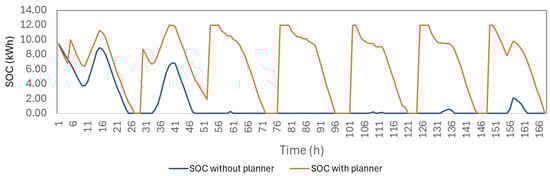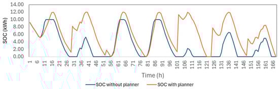 Figure 14 illustrates the state of charge (SOC) of the system, with and without using the planner. Without the planner, the electric battery only works by storing the excess energy produced by the PV system during periods of surplus generation. When the solar panels generate more electricity than the home requires, the excess energy is used to charge the battery instead of being sent back to the grid. Once the battery is fully charged, it remains on standby, ready to supply power when needed. As soon as the installation starts consuming energy from the grid, the battery automatically discharges to meet this demand, reducing grid reliance.