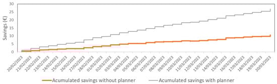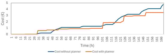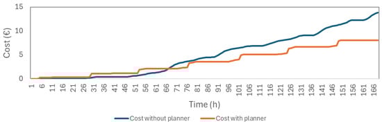 Figure 26 illustrates the effect on overall costs during the summer period. Similarly to the winter scenario, using the planner results in a slower cost increase, highlighting the savings obtained by strategically managing the charging and discharging of the TES. This approach enables the system to minimize energy usage during high-cost periods. On the other hand, without the planner, costs rise more rapidly, demonstrating the inefficiencies of relying on immediate energy use without taking advantage of storage to optimize consumption.