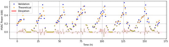 Figure 30 shows a characteristic consumption pattern with daily peaks, reflecting the system’s effort to reach the target temperatures during periods of higher thermal demand, such as mornings and evenings. Overall, there is an acceptable correlation between the theoretical and validation curves, suggesting that the theoretical model adequately captures the expected behavior of the HVAC system. The pink bars highlight certain discrepancies, which correspond to the difference between the predictions made by the proposed system and the measurements obtained in real operating conditions, where slight climatic fluctuations or changes in space occupation occur.