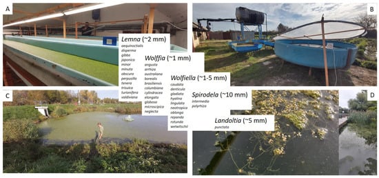Cultivation types ((A) indoor, sterile, controlled circumstances; (B) outdoor, semi-sterile circumstances; (C) outdoor, in fish pond, under semi-controlled circumstances; (D) in the wild) and some already known duckweed species.
