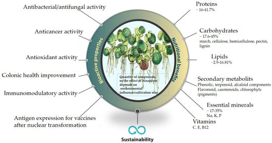 Different species of duckweed have protein contents ranging from 16% to 42% and provide all essential amino acids []. They also contain a variety of undigestible carbohydrates, including both cellulose and pectin, which support digestion, regulate blood sugar levels and promote gut health. In addition, duckweed is a rich source of micronutrients and phytochemical compounds, particularly lutein and β-carotene, which reduce the risk of many chronic diseases []. However, the utilisation of proteins and other bioactive compounds may be inhibited by several factors, including certain growing conditions [], cell wall properties [], secondary metabolites [], and antinutritive components []. Some physical, chemical, and biochemical processes are applicable to enhance the digestibility and bioavailability of food components [,]; however, a limited number of studies are available on how these treatments affect the nutritional and sensory properties of duckweeds. The present review focuses on some underexplored issues of duckweed production, with particular attention to their key nutrients and bioactive compounds. The factors limiting the utilisation of these components are also discussed. Moreover, some traditional and innovative technologies are introduced that are potentially applicable to improve the digestibility and bioavailability of nutrients and bioactive compounds.