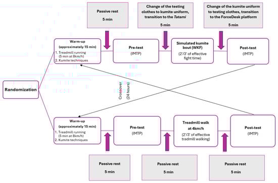 The experiment was carried out according to a randomized crossover study design. All subjects participated in two experimental sessions under different conditions (set 24h apart). An isometric mid-thigh pull (IMTP) test was performed in order to evaluate the acute effects of a simulated kumite bout (WKF formula) on the peak vertical force (PVF) in the dominant (front) and non-dominant (back) lower limbs based on the isometric mid-thigh pull (IMTP) asymmetry results. The study participants were randomly assigned to the following conditions: (1) an experimental condition (EXP)—2/3 min of effective fight time of a simulated kumite bout (WKF formula) and (2) a control condition (CTRL)—2/3 min of treadmill walking at moderate speed (4.0 km/h) []. All measurements were performed at two time points, i.e., (1) before and (2) after the simulated kumite bout. During the CTRL condition, measurements were also performed at the same time points; however, a treadmill walk was applied instead of the simulated kumite bout. A detailed description of the experimental procedures is provided in Section 2.3, while a flowchart of the study design is shown in Figure 1.
