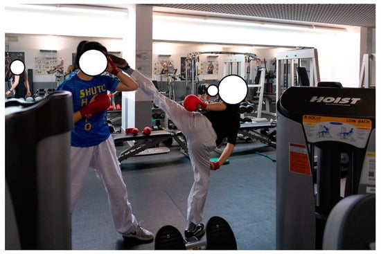 Combat sports and martial arts can be categorized into the following styles: (a) grappling, (b) striking, and (c) clinch [,]. Karate, in the WKF (World Karate Federation) formula, belongs to striking martial arts and is characterized by intermittent high-intensity actions, which include fighting in the stand-up position, within which punches and kicks are performed on the opponent’s body (kumite), or in the form of a structured routine (kata) []. However, although karate is believed to be a complex sport, a kumite bout is characterized by asymmetrical and unstructured movement patterns [].