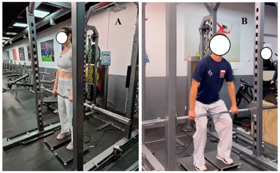The assessment of the strength performance in the lower limbs within isometric conditions was performed with the IMTP test, which is believed to be a gold standard to evaluate maximal isometric strength in elite combat sports athletes, including striking martial arts such as karate or taekwondo []. It is also recommended to evaluate the inter-limb asymmetries in athletes of various velocity-based sports [,,] since it has been demonstrated that the level of peak force, evaluated via the IMTP test, impacts the magnitude of asymmetries and might also have a greater influence on the incidence of inter-limb strength differences when compared to other variables such as sex []. The measurements were performed on a force plate (ForceDecks, Vald Performance, Brisbane, Australia). The force plate is known to have good reliability (interclass correlation coefficient (ICC) = 0.78) for measurements performed with the IMTP test []. In addition, during a single testing trial, the platform allows for obtaining PVF results for both lower limbs and separately for the left and right lower limbs. The platform was set at 1000 Hz of sampling and was positioned on the floor, under a power rack (KEISER 3111, Fresno, CA, USA), which allowed us to position the barbell at any height through hydraulic jacks and pins. The IMTP test was performed with a standardized Olympic barbell (Eleiko International, Halmstad, Sweden; mass: 20 kg, diameter: 2.8 cm, length: 1.92 m), and its position on the power rack was established based on the recommendations proposed by Beckham et al. [], i.e., 125° of the knee joint angle and 145° of the hip joint angle (upright torso) (Figure 3A,B). The above-mentioned testing position was chosen because it has been shown that forces generated in the cited angles of the hip and knee joints are the highest []. This enables the optimization of the force–time characteristics during the IMTP test []. Both the foot position on the platform and the hand placement on the barbell were volitional []. Moreover, a hand-held electronic goniometer (LIMIT, QC1932, Rzeszów, Poland) was used in order to assess the hip and knee joint angles before each test trial. The measurements were performed by two experienced researchers (EG, MD).