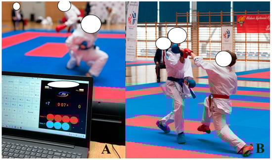 Prior to beginning the testing procedures, an event entitled ‘Scientific research of the Polish national team kumite athletes—Katowice 2024’ on the Sportdata.org platform [] was created within the license of the Polish Karate Union—Polish Karate Federation. As the Sportdata platform is an open-source platform for all sports events included in the WKF, in order to maintain Bioethical rules, the event was closed both for extrinsic registration and public access to any data related to this research. Only the project’s supervisor (EG) had access to import and export the participants’ data. The simulated WKF kumite bout was performed as a typical ‘OPEN’ category, according to which the study participants were grouped into their sex (male/female) and actual age categories (U16/U18/Seniors), without division on the weight categories. The Sportdata platform was operated by an experienced researcher (EG) (Figure 4A). The platform was used to (1) create the fighting draws, (2) describe the fighting color to all the study participants (AKA or AO), (3) control the remaining fighting time, and (4) present the given points or penalties during the simulated WKF kumite bouts, which were shown on a screen (Samsung 75″ QLED, UHD/4K, 3840 × 2160 px, Warsaw, Poland) that was connected to a laptop with Sportdata software.