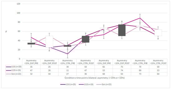 It was found that in the pre-tests, the incidence of a bilateral asymmetry over fifteen percent (>15%) was observed in the athletes from all the studied groups. However, the frequency was not high, excluding the athletes from the U18 category (47%). Moreover, the analysis of the qualitative data showed that the frequency of the above-mentioned asymmetry (>15%) increased after the simulated WKF kumite bout in the Seniors and decreased in the athletes from the U16 (10% of the athletes) and U18 (21% of the athletes) categories. Simultaneously, in the CTRL condition, the inter-limb asymmetry (>15%) significantly increased in the majority of the athletes, i.e., U16 (50%), U18 (47%), and Seniors (36%).