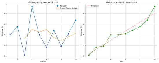 NAS progression for NTU-Fi dataset showing iteration-wise accuracy (left) and architecture performance ranking with ascending values (right).