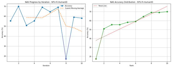 NAS progression for NTU-Fi-HumanID showing iteration-wise accuracy (left) and architecture performance ranking with ascending values (right).