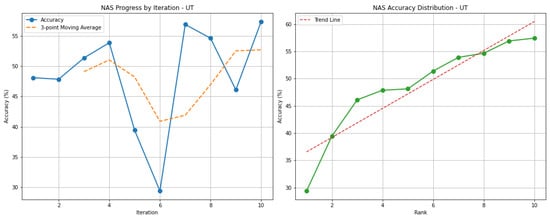 NAS progression for UT-HAR dataset showing iteration-wise accuracy (left) and architecture performance ranking with ascending values (right).