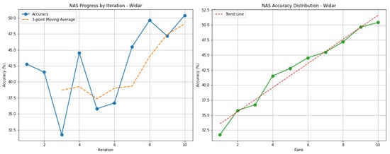 NAS progression for Widar dataset showing iteration-wise accuracy (left) and architecture performance ranking with ascending values (right).