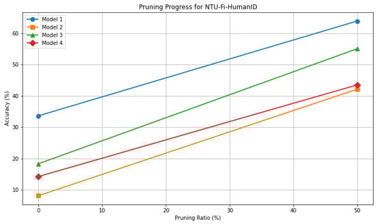 Analysis of the NTU-Fi-HumanID dataset reveals a systematic and uniform pattern of accuracy improvements across all model variants under 50% pruning conditions, as shown in Figure 6. The quantitative results demonstrate remarkable consistency in performance enhancement across all architectures.