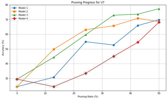 Model 2 demonstrates steady performance enhancement, improving from 24.30% to 70.88% at 42% pruning ratio, though showing a slight decline to 68.57% in the final stage. This pattern suggests an optimal pruning threshold around 42%, beyond which the model begins to lose some discriminative capacity.