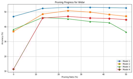 These diverse pruning responses in the Widar dataset provide valuable insights into the relationship between architectural complexity and gesture recognition capability. The varying patterns suggest that gesture recognition tasks require careful consideration of pruning thresholds, as excessive parameter reduction can directly impact the model’s ability to capture subtle motion patterns. The stability exhibited by Model 1 and the early improvement shown by Model 4 particularly demonstrate that effective pruning can maintain or enhance gesture recognition performance when appropriately calibrated to the architectural characteristics.