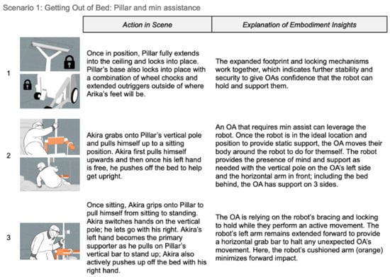 Overall, the type of physical assistance the robot embodiments can provide varies between min and mod assist. In the scenario with PILLAR (Figure 6), Akira can get up by himself but needs to hold on to something (min assist). In the scenarios with DUO and TRIbot (Figure 7), Akira needs help sitting up (mod assist), then stands up on his own (min assist). For all robot embodiments, Akira then uses his cane to walk out of the bedroom.