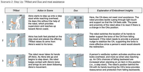 This scenario demonstrated how different robot embodiments could support Akira while he balanced on a step stool while reaching overhead to place an object on a high shelf. While the ritual of placing an offering in Akira’s home shrine is culture-specific, the task of stepping on to a step stool and the risk of falling is common to both US and JP OAs. Each embodiment had different benefits for supporting Akira, and the type of physical assistance the robot embodiments can provide varies between min and mod assist. In the scenario with PILLAR (Figure 8), Akira needs min assist and pulls up on and leans on PILLAR. In the scenario with DUO (Figure 9), Scoot provides a similar min assist to PILLAR, while Dex contact guards Akira from behind while he stands on a stool, which is similar to the scenario with TRIbot (Figure 9). TRIbot and Dex’s contact guard positions here are necessary as there is a higher chance that an OA will lose their balance and fall backward when stepping off the stool.