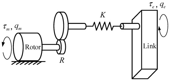 The flexibility of a robot is mainly embodied in its joints and links. As depicted in Figure 3, the elastic joint can be represented by a linear torsional spring characterized by a stiffness coefficient K and a reduction gear with a specified gear ratio R. Given that the stiffness of the link significantly exceeds that of the joint, it is reasonable to regard the link as a rigid body for the purposes of modeling. Therefore, the flexible dynamic model of an n-DoF robot can be described as follows: