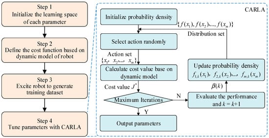 Assuming the parameter set in Equations (2)–(6) is and represents the i-th independent parameter, a value range called the learning space needs to be determined, which is used to limit the tuning process and is of great significance in improving the convergence rate and stability. The preliminary parameters acquired previously are taken as the intermediate values to construct the learning space. Since CAD models usually have high accuracy, the actual inertia-related parameters are close to the preliminary values. Hence, the corresponding learning spaces can be configured to smaller ranges. The stiffness- and friction-related parameters always have bigger gaps compared to the actual values. And the boundary of learning spaces should be set far from the initial values. Then, Step 2 is performed.