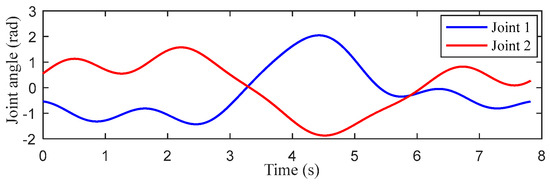 As shown in Figure 5, a 2-DoF planar robot is employed for evaluation. The motion control and data collection are realized by a self-developed controller with a sampling frequency of 1 KHz. Each joint is equipped with two encoders, which can measure the motor angle and joint output angle, respectively. The flexible dynamic model for the planning robot is depicted in Appendix A. After the preliminary identification, the learning spaces of the inertia-related parameters are configured between 90% and 110% of the preliminary values. The friction model is more complex, and thus, the corresponding learning spaces are set between 80% and 120%. The stiffness parameters form product manuals always have a big gap with the actual values. Hence, the learning spaces are set between 50% and 150%.