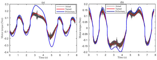 Simulation and actual motor torques of each motor. (a) Motor 1. (b) Motor 2.