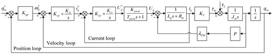 The permanent magnet synchronous motors (PMSMs) are always employed in IRs. The associated servo system can be streamlined, as depicted in Figure 8, revealing three nested control loops within the servo driver. The innermost loop, known as the current loop, directly drives the motor and comprises a current controller along with various functional modules, including coordinate transformation modules, a Space Vector Pulse Width Modulation (SVPWM) generator, current detection mechanisms, and feedback systems. The outer loops, namely, the velocity and position loops, are relatively simpler and incorporate a velocity controller and a position controller, respectively, to ensure precise motor control and positioning, respectively. is the stator inductance, is the stator phase resistance, is the torque coefficient, is the load torque, is the number of magnetic linkage, is the pole-pair number, and and are the amplification factor and time constant of the simplified SPWM inverter.