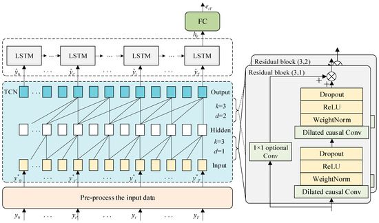 Since a TCN can effectively extract and compress the discontinuous features among multi-source variables while LSTM is good at capturing long- and short-term dependencies, the proposed REC adopts the scheme to integrate a TCN and LSTM to leverage both of their merits instead of struggling with which one to choose. The architecture of the suggested REC, which is founded on TCN-LSTM, is presented in Figure 9, where a TCN is used as the input to LSTM. Taking full advantage of a TCN and LSTM, the original data can be processed to extract useful spatial and temporal characteristics. Hence, large-range and deep patterns can be captured to improve prediction accuracy and stability. Hereinafter are the intricate parts of the REC presented in detail.