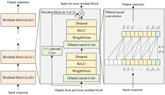 A TCN is a distinctive class of one-dimensional fully convolutional neural networks characterized by three key components: causal convolutions, dilated convolutions, and residual blocks. Unlike traditional convolutions, the output at time t in a higher layer using causal convolution is solely influenced by the inputs from the same time t and previous time steps in the lower layer. Hence, the extracted features satisfy the causality, indicating CNN can be applied to time-series modeling. However, for complex sequential tasks, multi-layer or large filters are required to increase the receptive field of causal convolutions, leading to overly complex and computationally intensive models. Therefore, using dilated convolution with a hyperparameter d allows for a significant expansion of the receptive field, which is crucial for detecting long-range patterns within the relevant historical data. In addition, residual connections are embedded in the TCN to prevent performance degradation and avoid gradient vanishing. The complete structure of a TCN network is shown in Figure 10.